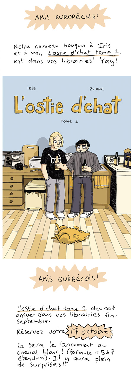 Je serai au Salon Nouveau Genre à Québec en fin de semaine! Au menu: mon nouveau fanzine "Petites Histoires no.2", le fanzine collectif de Richard Suicide (qui sera là-bas avec moi), "Puanteur Froide", tout mon stock d'affiches et de fanzines et des macarons et tatouages temporaires de l'Ostie d'chat! Venez nous voir!